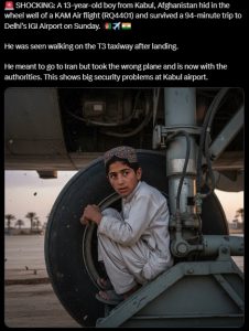 ಬಾಲಕನನ್ನು ಹೆಚ್ಚಿನ ವಿಚಾರಣೆ ನಡೆಸಿದ ವೇಳೆ ತಾನು ಕಾಬೂಲ್ ವಿಮಾನ ನಿಲ್ದಾಣದಲ್ಲಿ ಅಧಿಕಾರಿಗಳ ಕಟ್ಟು ತಪ್ಪಿಸಿ ಪ್ರವೇಶಿಸಿ ಅಲ್ಲಿದ್ದ (KAM Airlines) ವಿಮಾನದ ಲ್ಯಾಂಡಿಂಗ್ ಗೇರ್ ಬಳಿ ಇರುವ ಜಾಗದಲ್ಲಿ ಅವಿತು ಕುಳಿತ್ತಿದ್ದೆ ಅದು ನಿಜಕ್ಕೂ ಎಲ್ಲಿಗೆ ಹೋಗುವ ವಿಮಾನ ಎಂಬುದು ನನಗೆ ಗೊತ್ತಿರಲಿಲ್ಲ ವಿಮಾನದಲ್ಲಿ ಸುಮಾರು ಎರಡು ಗಂಟೆಗಳಷ್ಟು ಕಾಲ ಹಾರಾಟ ನಡೆಸಿ ಬಳಿಕ ಲ್ಯಾಂಡಿಂಗ್ ಆಗಿದೆ ಎಂದು ಹೇಳಿಕೊಂಡಿದ್ದಾನೆ, ಬಳಿಕ ಬಾಲಕನನ್ನು ಅದೇ ವಿಮಾನದ ಮೂಲಕ ಅಧಿಕಾರಿಗಳು ಕಳುಹಿಸಿಕೊಟ್ಟಿರುವುದಾಗಿ ತಿಳಿಸಿದ್ದಾರೆ.