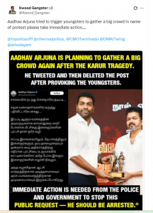 ಈ ಪೋಸ್ಟ್, ಕರೂರಿನಲ್ಲಿ ವಿಜಯ್ ನೇತೃತ್ವದ ರ್ಯಾಲಿಯ ವೇಳೆ ಸಂಭವಿಸಿದ ಕಾಲ್ತುಳಿತದಲ್ಲಿ 41 ಜನರು ಸಾವಿಗೀಡಾದ ದುರಂತದ 48 ಗಂಟೆಗಳ ಒಳಗೆ ಪ್ರಕಟಗೊಂಡಿರುವುದರಿಂದ ಹೆಚ್ಚಿನ ಗಮನ ಸೆಳೆದಿದೆ. ಡಿಎಂಕೆ ಲೋಕಸಭಾ ಸಂಸದೆ ಕನಿಮೋಳಿ ಈ ಹೇಳಿಕೆಯನ್ನು “ಬೇಜವಾಬ್ದಾರಿ” ಎಂದು ಟೀಕಿಸಿ, ಅದು ಹಿಂಸಾಚಾರಕ್ಕೆ ಪ್ರಚೋದನೆ ನೀಡುತ್ತದೆ ಎಂದು ಎಚ್ಚರಿಸಿದರು.