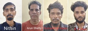 ಸುಶಾಂತ್ @ ಕಡವಿ(29), ತಂದೆ: ಆನಂದ, ವಾಸ: ಕಟ್ಲ ಮನೆ, ಕಾನ ಸುರತ್ಕಲ್, ಕೆ ವಿ ಅಲೆಕ್ಸ್(27), ತಂದೆ: ವರ್ಗೀಸ್, ವಾಸ: ಬೈಕಲ ಮನೆ, ಕಾನ ಕಟ್ಲ, ಇಡ್ಯಾ ಗ್ರಾಮ, ನಿತಿನ್(26), ತಂದೆ: ಮಂಕು ಕುಲಾಲ್ ವಾಸ: ಶಿವಕೃಪಾ ಇಂದಿರಾ ಕಟ್ಟೆ, ಸುರತ್ಕಲ್ ಮತ್ತು ಆರೋಪಿಗಳಿಗೆ ಆಶ್ರಯ ಕೊಟ್ಟ ಆರುಣ್ ಶೆಟ್ಟಿ(56), ತಂದೆ: ದಿ: ಡಿ ಸುರೇಂದ್ರನಾಥ, ವಾಸ: ವಿದ್ಯಾನಗರ ರಸ್ತೆ, ಕುಳಾಯಿಗುಡ್ಡೆ ಹೊನ್ನಕಟ್ಟೆ ಎಂಬವರನ್ನು ವಶಕ್ಕೆ ಪಡೆದುಕೊಳ್ಳಲಾಗಿರುತ್ತದೆ. ಈ ಪೈಕಿ ಈ ಪ್ರಕರಣದಲ್ಲಿ ಭಾಗಿಯಾದ ಪ್ರಮುಖ ಆರೋಪಿ ಗುರುರಾಜ್ ಆಚಾರಿ ಹಾಗೂ ಆರೋಪಿಗಳಿಗೆ ಅರುಣ್ ಶೆಟ್ಟಿಯೊಂದಿಗೆ ಅಶ್ರಯ ನೀಡಿದ ಅಶೋಕ್ ಎಂಬಾತ ತಲೆಮರೆಸಿಕೊಂಡಿದ್ದು, ಪತ್ತೆ ಕಾರ್ಯ ಮುಂದುವರಿದಿದೆ.