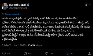 “ಇಂದು, ನಾವು ಕನ್ನಡ ರಾಜ್ಯೋತ್ಸವವನ್ನು ಆಚರಿಸುತ್ತಿರುವಾಗ, ಕರ್ನಾಟಕದ ಜನರಿಗೆ ಪ್ರತೀಕವಾಗಿರುವ ಶ್ರೇಷ್ಠತೆ ಮತ್ತು ಶ್ರಮಶೀಲ ಸ್ವಭಾವವನ್ನು ನಾವು ಆಚರಿಸುತ್ತೇವೆ” ಎಂದು ಕನ್ನಡಿಗರಿಗೆ ಕನ್ನಡದಲ್ಲೇ ರಾಜ್ಯೋತ್ಸವ ಶುಭಾಶಯ ತಿಳಿಸಿ ಮೋದಿ ಎಕ್ಸ್ ಪೋಸ್ಟ್ ಹಂಚಿಕೊಂಡಿದ್ದಾರೆ.