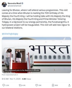 ‘ನನ್ನ ಈ ಭೇಟಿ ಸ್ನೇಹ ಸಂಬಂಧ ಬಲಗೊಳ್ಳಲಿದೆ ಮತ್ತು ಪ್ರಗತಿ ಹಾಗೂ ಅಭ್ಯುದಯದಲ್ಲಿ ನಮ್ಮ ಜಂಟಿ ಪ್ರಯತ್ನ ಇನ್ನಷ್ಟು ಗಟ್ಟಿಯಾಗಲಿದೆ ಎಂದು ನಾನು ನಂಬಿದ್ದೇನೆ’ ಎಂದು ಪ್ರಧಾನಿ ಪ್ರಯಾಣಕ್ಕೂ ಮುನ್ನ ಹೇಳಿದ್ದಾರೆ. ‘ನಾಲ್ಕನೇ ದೊರೆಯ 70ನೇ ಜನ್ಮದಿನಾಚರಣೆಯ ಸಂದರ್ಭದಲ್ಲಿ ಜನರೊಂದಿಗೆ ಪಾಲ್ಗೊಳ್ಳುವುದು ಗೌರವದ ವಿಷಯ’ ಎಂದು ಅವರು ಹೇಳಿದ್ದಾರೆ.