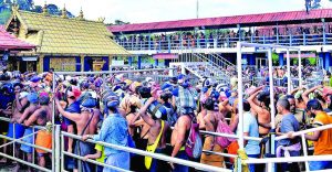 ಪಂದಳಂ: ಶಬರಿಮಲೆಯಲ್ಲಿ ಯಾತ್ರಿಕರ ಸಂಖ್ಯೆ ತೀರಾ ಹೆಚ್ಚಿದ್ದು, ಅಯ್ಯಪ್ಪ ದರ್ಶನ ಮಾಡಲು ಇಡೀ ದಿನ ಕಾಯಬೇಕಾದ ಪರಿಸ್ಥಿತಿ ಬಂದೊದಗಿದೆ. ಮುಂಜಾನೆ ಬಂದವರಿಗೆ ಸಂಜೆ, ಸಂಜೆ ಬಂದವರಿಗೆ ಮರುದಿನ ಅಯ್ಯಪ್ಪನ ದರ್ಶನ ಭಾಗ್ಯ ದೊರಕುತ್ತಿದೆ. ಕೇವಲ ನೂರು ಮೀಟರ್ ಸಾಗಲು ಎರಡು ಗಂಟೆಗಳಿಗಿಂತ ಹೆಚ್ಚು ಸಮಯ ಹಿಡಿಯಲಾರಂಭಿಸಿದೆ.