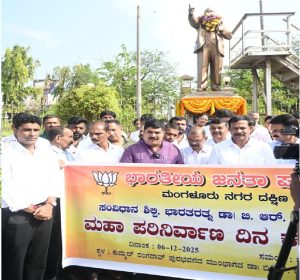 ಮಂಗಳೂರು: ಸಂವಿಧಾನ ಶಿಲ್ಪಿ, ಭಾರತ ರತ್ನ ಡಾ. ಬಿ. ಆರ್ ಅಂಬೇಡ್ಕರ್ ಅವರ ಮಹಾ ಪರಿನಿರ್ವಾಣ ದಿನದಂದು ಬಿಜೆಪಿ ಮಂಗಳೂರು ನಗರದ ದಕ್ಷಿಣ ಮಂಡಲದ ಎಸ್ಸಿ ಮೋರ್ಚಾ ವತಿಯಿಂದ ಕುದ್ಮುಲ್ ರಂಗರಾವ್ ಪುರಭವನದ ಮುಂಭಾಗದಲ್ಲಿರುವ ಅಂಬೇಡ್ಕರ್ ಪ್ರತಿಮೆಗೆ ಗೌರವಪೂರ್ವಕ ಪುಷ್ಪ ನಮನಗಳನ್ನು ಸಲ್ಲಿಸಲಾಯಿತು.