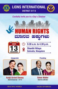 ಮಂಗಳೂರು: ಲಯನ್ಸ್ ಇಂಟರ್ನ್ಯಾಷನಲ್ ಡಿಸ್ಟ್ರಿಕ್ಟ್ 317 D ವತಿಯಿಂದ ಡಿಸೆಂಬರ್ 13, 2025ರಂದು ಮಂಗಳೂರಿನ ಬಾಲಮಟ್ಟದ ಶಾಂತಿ ನಿವಾಸದಲ್ಲಿ ‘ಮಾನವ ಹಕ್ಕುಗಳು’ ಎಂಬ ವಿಷಯದ ಮೇಲೆ ಏಕದಿನ ಕಾರ್ಯಾಗಾರವನ್ನು ಆಯೋಜಿಸಲಾಗಿದೆ. ಬೆಳಿಗ್ಗೆ 9.30 ರಿಂದ ಸಂಜೆ 4.30ರವರೆಗೆ ನಡೆಯುವ ಈ ಸಮ್ಮೇಳನದಲ್ಲಿ ಕಾನೂನು, ಪೊಲೀಸ್ ಇಲಾಖೆ ಹಾಗೂ ಸಮಾಜ ಸೇವಾ ಕ್ಷೇತ್ರದ ಗಣ್ಯರು ಭಾಗವಹಿಸಲಿದ್ದಾರೆ.
