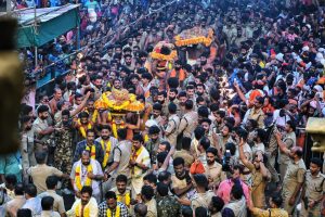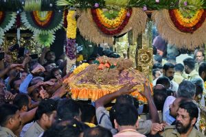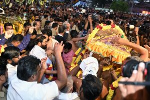 ಶಬರಿಮಲೆ: ಮಕರ ಸಂಕ್ರಾಂತಿ ಹಾಗೂ ಮಕರವಿಳಕ್ಕು ಮಹೋತ್ಸವದ ಅಂಗವಾಗಿ ಪಂದಾಳಂ ಅರಮನೆಯಿಂದಪವಿತ್ರ ತಿರುವಾಭರಣ ಮೆರವಣಿಗೆ ಬುಧವಾರ ಸಂಜೆ ಸಬರಿಮಲೆ ಸನ್ನಿಧಾನಕ್ಕೆ ಭಕ್ತಿಭಾವದಿಂದ ಆಗಮಿಸಿದ್ದು, ಅದನ್ನು ಶ್ರೀ ಅಯ್ಯಪ್ಪ ಸ್ವಾಮಿಗೆ ಸಮರ್ಪಿಸಲಾಯಿತು. ಮೆರವಣಿಗೆಯನ್ನು ದೇವಸ್ವಂ ಸಚಿವ ವಿ.ಎನ್. ವಾಸವನ್ ಅವರು ಧ್ವಜಸ್ತಂಭದ ಬಳಿ ಭವ್ಯವಾಗಿ ಬರಮಾಡಿಕೊಂಡರು.