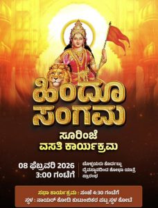 ಮಂಗಳೂರು: ಹಿಂದೂ ಸಂಗಮ ಸೂರಿಂಜೆ ವಸತಿ ಕಾರ್ಯಕ್ರಮವು ಫೆ. 08(ಭಾನುವಾರ) ರಂದು ನಡೆಯಲಿದ್ದು, ಸಂಜೆ 3.30 ಗಂಟೆಗೆ ಬೊಳ್ಳಯರು ಕೊರ್ದಬ್ಬು ದೈವಸ್ಥಾನದಿಂದ ಭವ್ಯ ಶೋಭಾಯಾತ್ರೆ ಪ್ರಾರಂಭವಾಗಲಿದೆ.