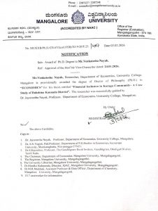 ಮಂಗಳೂರು: ಮಂಗಳೂರು ವಿಶ್ವವಿದ್ಯಾನಿಲಯದ ಅರ್ಥಶಾಸ್ತ್ರ ವಿಭಾಗದಲ್ಲಿ ನಡೆಸಿದ ಮಹತ್ವದ ಸಂಶೋಧನೆಗಾಗಿ ವೆಂಕಟೇಶ ನಾಯಕ್ ಅವರಿಗೆ ಡಾಕ್ಟರ್ ಆಫ್ ಫಿಲಾಸಫಿ (ಪಿಎಚ್.ಡಿ.) ಪದವಿಯನ್ನು ಪ್ರದಾನ ಮಾಡಲಾಗಿದೆ.