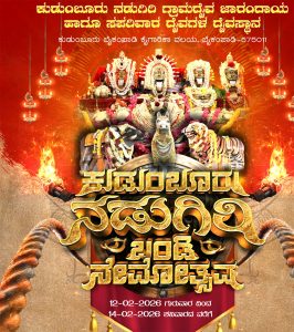 ಇದೇ ಬರುವ ಫೆಬ್ರವರಿ 12 ರಿಂದ ಫೆಬ್ರವರಿ 14ರ ವರೆಗೆ ಮೂರು ದಿನಗಳ ಕಾಲ ಜಾರಂದಾಯ ಹಾಗೂ ಪರಿವಾರ ದೈವಗಳ ಈ ಪವಿತ್ರ ಬಂಡಿ- ನೇಮ ಅತ್ಯಂತ ವೈಭವದಿಂದ ಜರುಗಲಿದೆ. ಈ ಮಹತ್ವದ ಧಾರ್ಮಿಕ ಕಾರ್ಯಕ್ರಮದ ಕುರಿತು ಕುಡುಂಬೂರು ಬಾಕಿಮಾರ್ ಕೊಡಿಯ ಪುಷ್ಪರಾಜ್ ಶೆಟ್ಟಿ ಅವರು ಭಕ್ತಾದಿಗಳಲ್ಲಿ ವಿಶೇಷ ಮನವಿ ಮಾಡಿದ್ದಾರೆ.