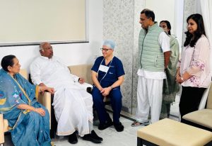 ಮಂಗಳೂರು: ಅನಾರೋಗ್ಯ ಹಿನ್ನೆಲೆಯಲ್ಲಿ ಬೆಂಗಳೂರಿನ ನಾರಾಯಣ ಹೃದಯಾಲಯದಲ್ಲಿ ಚಿಕಿತ್ಸೆ ಪಡೆದು ಗುಣಮುಖರಾಗುತ್ತಿರುವ ವಿಧಾನ ಪರಿಷತ್ ಶಾಸಕರು ಹಾಗೂ ಕೆಪಿಸಿಸಿ ಕಾರ್ಯಾಧ್ಯಕ್ಷರು ಆಗಿರುವ ಮಂಜುನಾಥ ಭಂಡಾರಿ ಅವರನ್ನು ಇಂದು ಎಐಸಿಸಿ ಅಧ್ಯಕ್ಷರಾದ ಮಲ್ಲಿಕಾರ್ಜುನ ಖರ್ಗೆ ಅವರು ಪತ್ನಿ ಸಮೇತ ಭೇಟಿಯಾಗಿ ಅರೋಗ್ಯ ವಿಚಾರಿಸಿದರು.
