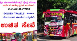 ಮಂಗಳೂರು: ಕಟೀಲು ದುರ್ಗಾಪರಮೇಶ್ವರಿ ಅಮ್ಮನವರ ವಾರ್ಷಿಕ ಜಾತ್ರೋತ್ಸವದ ಪ್ರಯುಕ್ತ ಇಂದು(ಏ.21) ಗೋಲ್ಡನ್ ಟ್ರಾವೆಲ್ಸ್ ಸಂಸ್ಥೆಯ ಕಟೀಲು ಮಾರ್ಗವಾಗಿ ಬೆಳಿಗ್ಗೆಯಿಂದ ಸಂಜೆಯವರೆಗೆ ಚಲಿಸುವ ಎಲ್ಲಾ ಎಂಟು ಸರ್ವಿಸ್ ಬಸ್ಗಳು ಪ್ರಯಾಣಿಕರಿಗೆ ಉಚಿತ ಪ್ರಯಾಣದ ಸೇವೆಯನ್ನು ನೀಡಲಿದೆ.